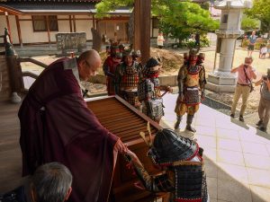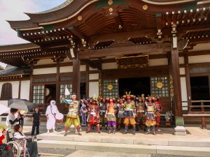 里見家主従の墓がある大岳院にて法要・出陣の儀の後、里見忠義と八犬士に扮した行列が倉吉赤瓦周辺を練り歩き、ゆかりの地北野神社を参拝しました。午後は里見まつりのステージイベントに登壇しまつりに花を添えました。